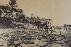 The picture shows the Plantation before the promenade was built from Egremont to New Brighton and was later known as the Tower Grounds. The rocks below show the condition of the shore along which pedestrians had to walk, before the promenade was built. The house in the background was owned by Misses Molyneux, When she died it was left to Captain Molyneux and on his death the grounds and house was sold to the Tower Company. |